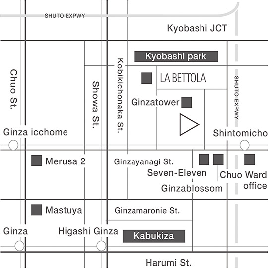 - 지하철 히비야선/아사쿠사선 히가시긴자A7번 출구→8분