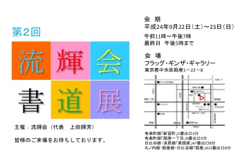 流輝会 かな書道の小さな展覧会 日展複数回入選の上田輝芳先生の門下生による、かな書道の小さな展覧会です。 9月22日(土)11:00−19:00 9月23日(日)11:00−17:00